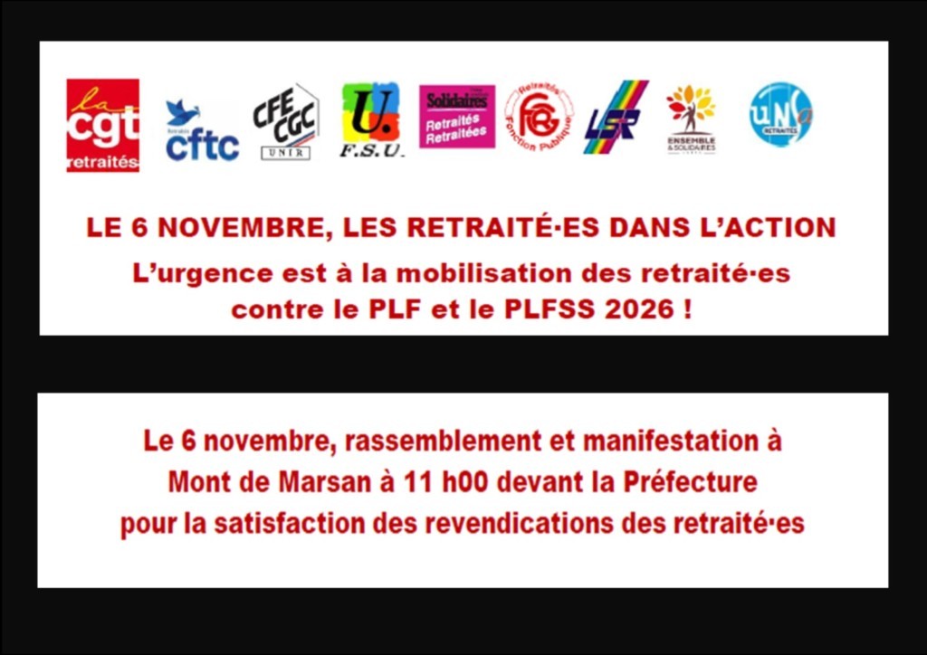 Le 6 novembre les retraité.es des organisations CGT, CFTC, CFE-CGC, FSU, SOLIDAIRES FGR-FP et des associations LSR, ENSEMBLE et solidaires se mobilisent et occuperont la rue parce qu’ils et elles s’opposent au projet de budget de financement de la Sécurité sociale de LECORNU et refusent d’être la cible privilégiée.